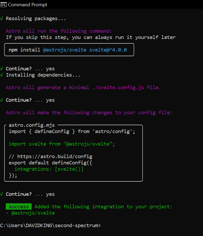 上述命令将安装所需的软件包,并请求更改关键文件的权限。接受调整后,Svelte 就能与 Astro 应用程序完美配合。