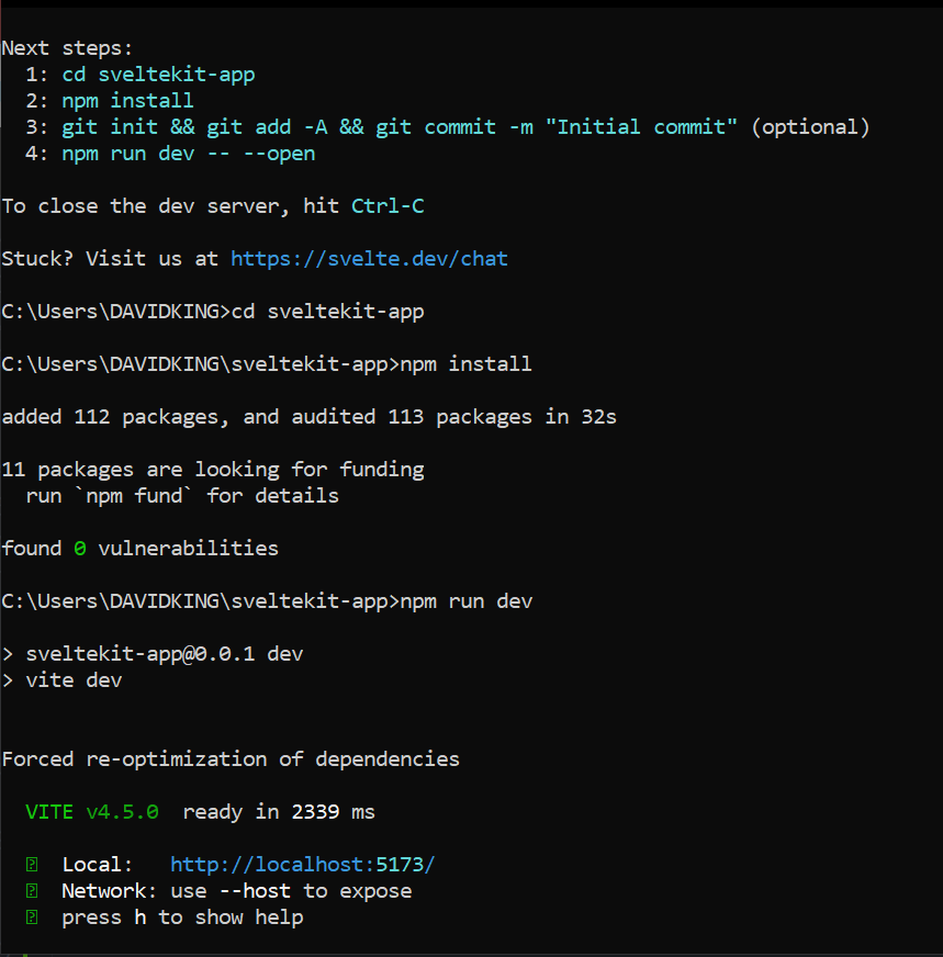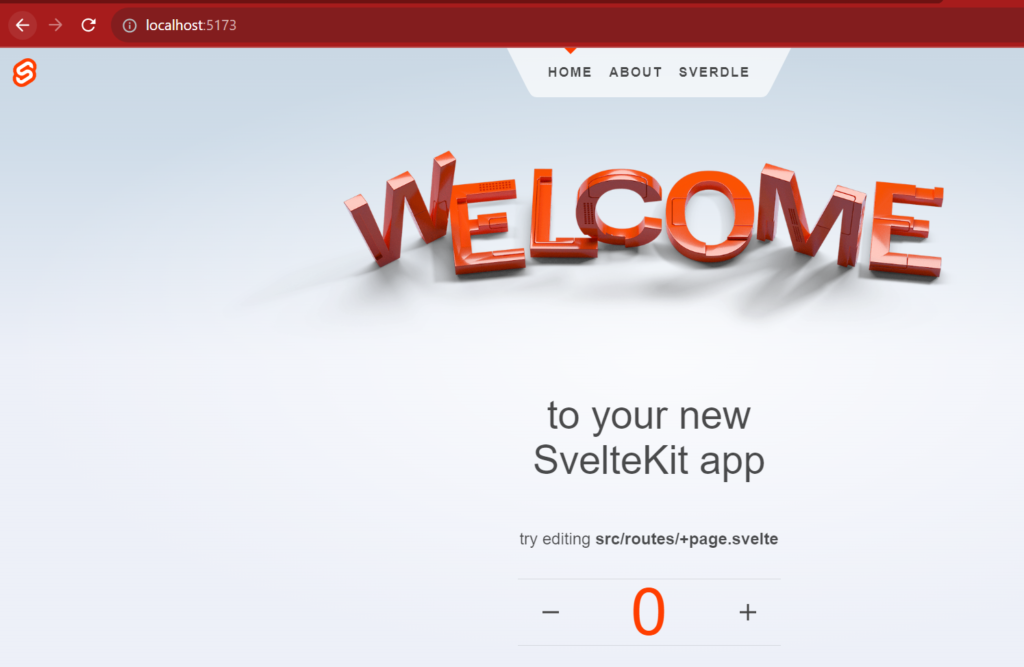 这将启动 SvelteKit 开发服务器,您应该会在终端中看到输出,表明您的项目正在本地运行。下面是在 http://localhost:5173 上运行的情况