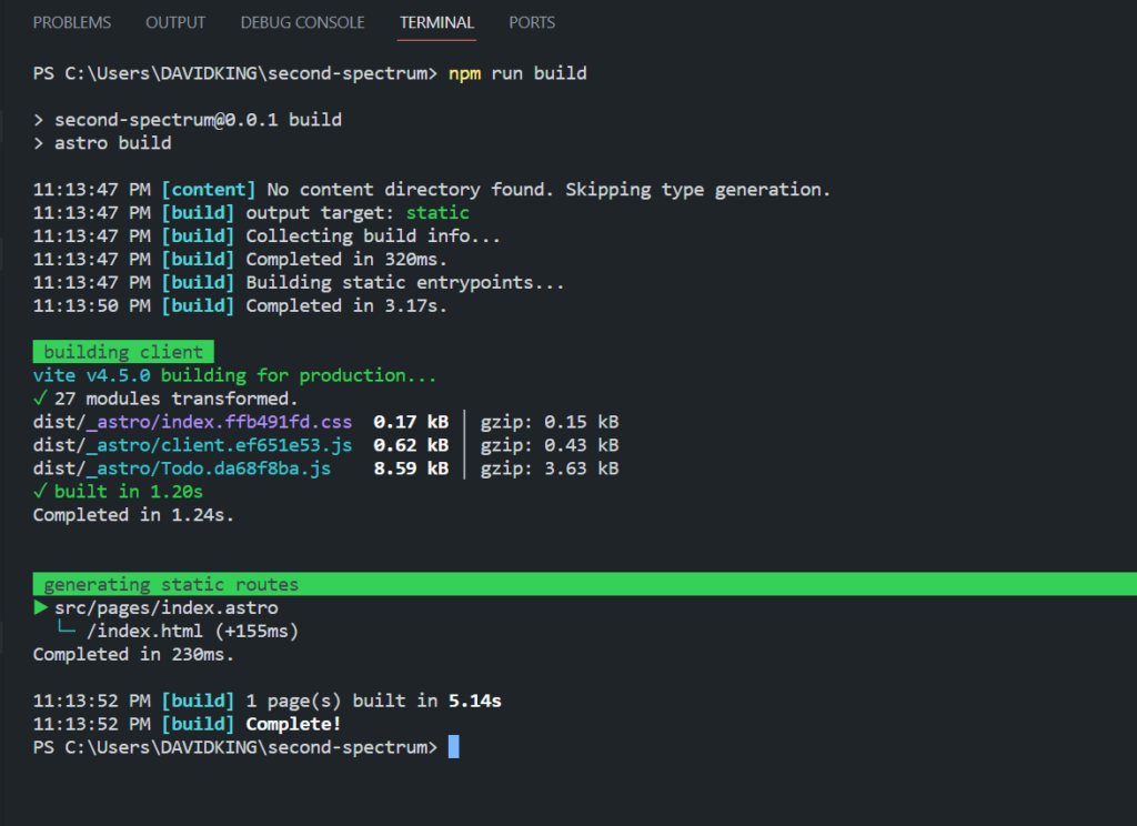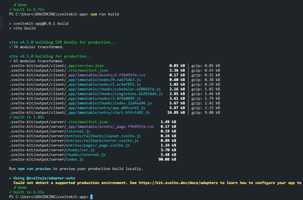 运行该命令后,Astro + Svelte 应用程序的构建时间和大小为: