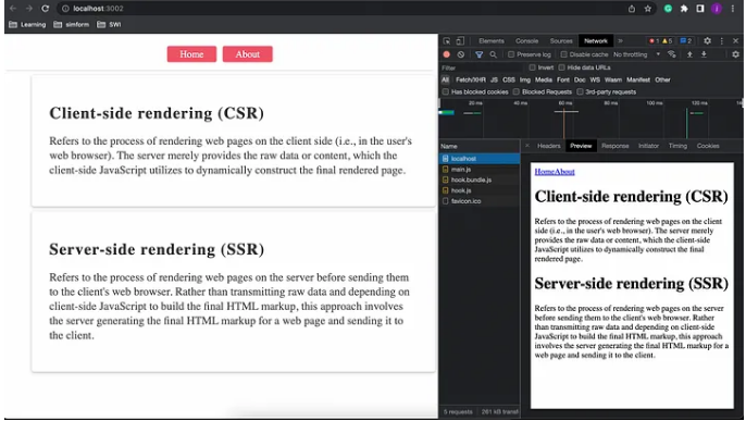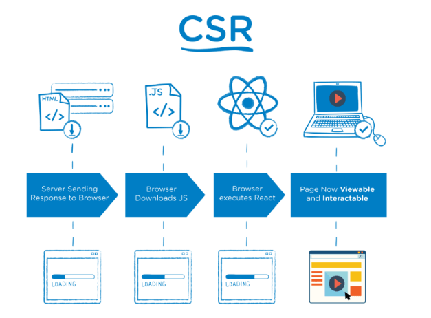 如果没有 SSR,就会出现客户端呈现,即浏览器获取并呈现 HTML。当索引不能正确处理 JavaScript 时,这种策略可能有助于搜索引擎优化(SEO)。在通过缓慢的网络下载庞大的 JavaScript 包时,这种策略也很有用。