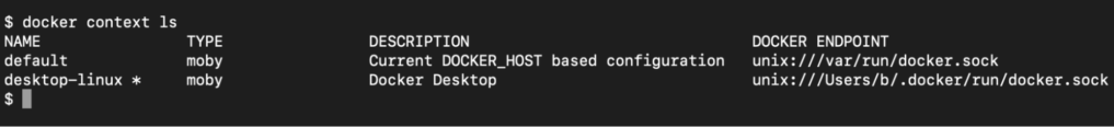 该命令可帮助您导航和配置不同的上下文。在 Docker 中,上下文包括名称、传输层安全信息、端点配置和协调器。