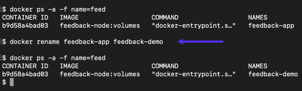使用此命令重命名容器。如果您有多个容器,并希望根据用途对它们进行区分,那么这条命令就非常有用。