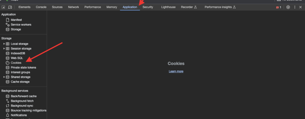 - 查看在 “应用” 选项卡中 Cookie,查找左侧边栏中的 “Cookie”。点击它将显示与当前网站相关的所有域。选择一个域即可查看其相关的 Cookie。