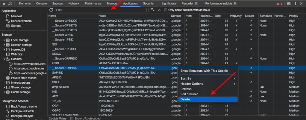 - 删除 Cookie:要删除 cookie,请右键单击列表中的 cookie 并选择 “删除 “或使用底部的 “删除 “按钮。此操作将从浏览器中删除 cookie。