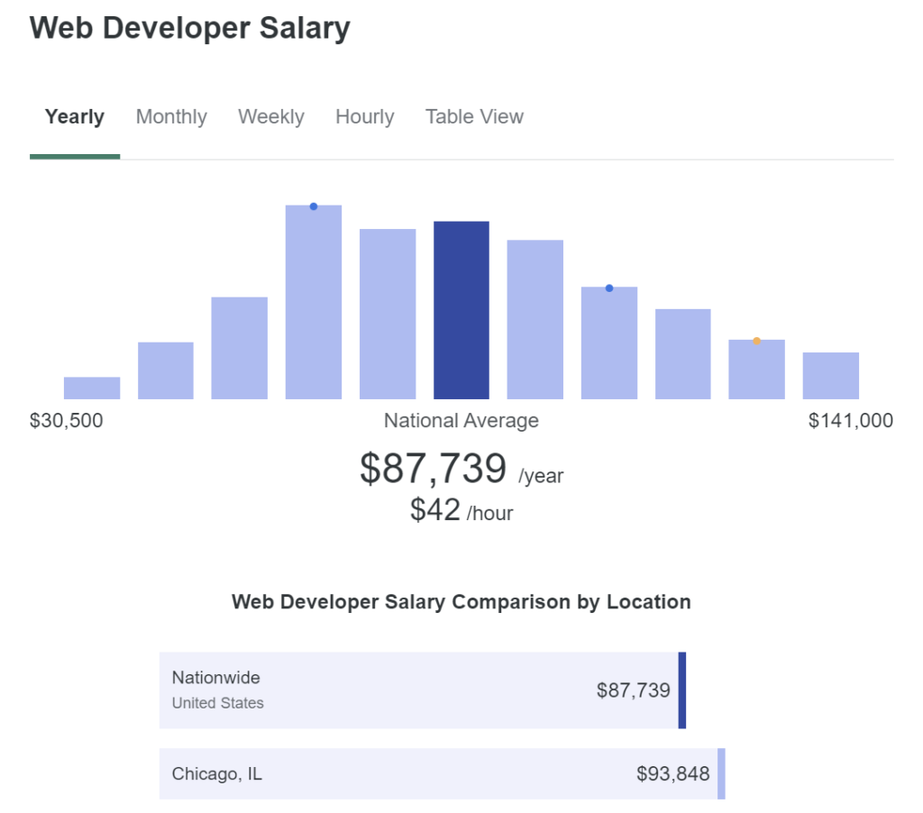 这一职位不仅需求量大,而且网络开发人员可以轻松赚取六位数的薪水。截止 2023 年 10 月,网络开发人员的平均工资为 87,739 美元。