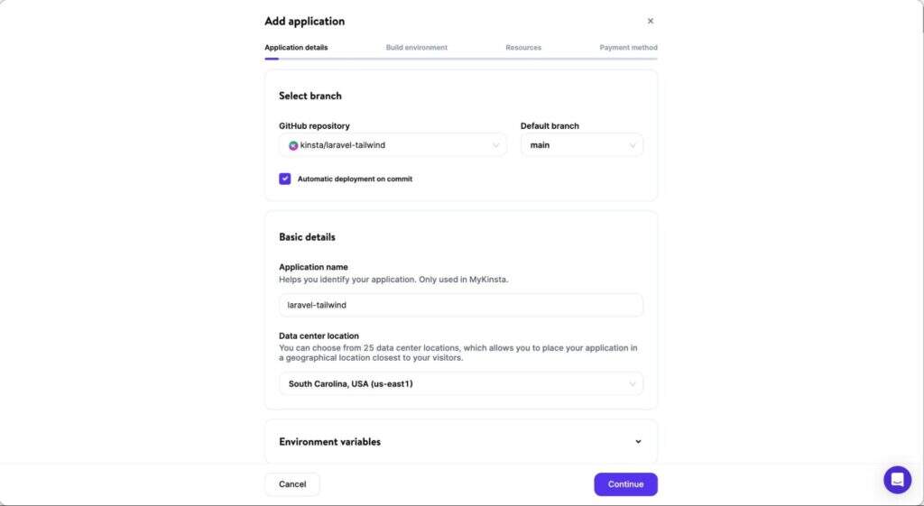 在 Kinsta 上配置新应用程序的详细信息