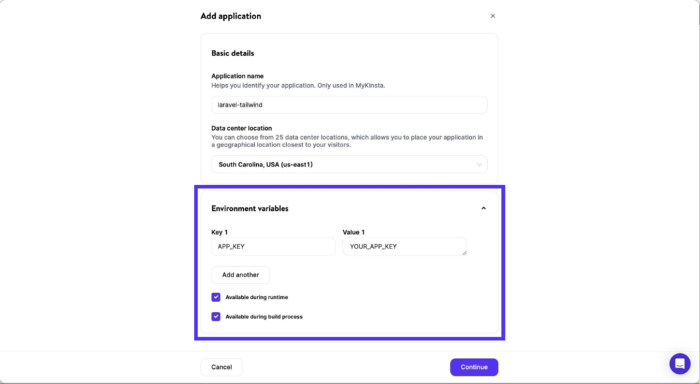 5. 在 Environment variables 部分添加 Laravel APP_KEY 。密钥位于本地项目目录的 .env 文件中。