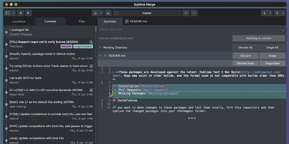 Sublime Text是一款为Git工作提供独立图形用户界面(GUI)的编辑器。如果你使用的是Sublime Text,那么Sublime Merge将是你工作流程的理想补充:
