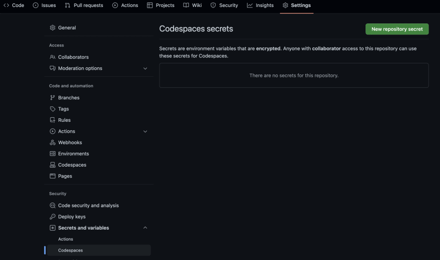在你的新版本库中,导航到Settings > Secrets and variables > Codespaces。你也可以通过导航到一个类似这样的URL来找到正确的页面: https://github.com/REPLACE_WITH_GITHUB_OWNER/REPLACE_WITH_GITHUB_REPO/settings/secrets/codespaces