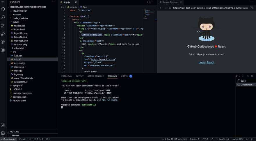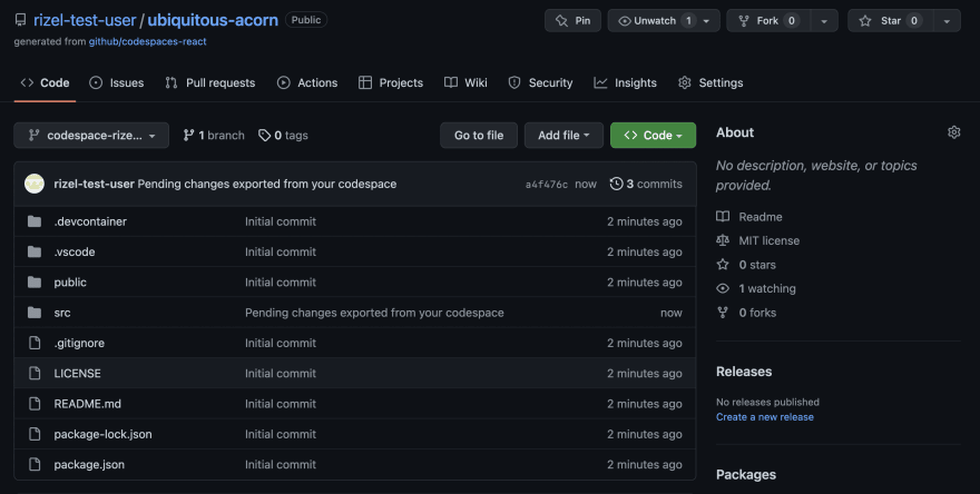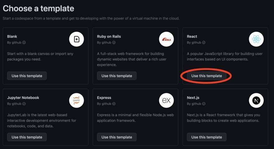 在本教程中,我们将导航到https://github.com/codespaces/templates,并选择React模板。