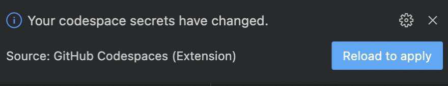 一旦你添加了新的API密钥,你的Codespaces应该 “Auto” 认识到你向你的Codespaces添加了新的秘密。如果是这样,你的Codespaces将弹出一个通知,说:”Your codespace secrets have changed. Reload to apply。”
