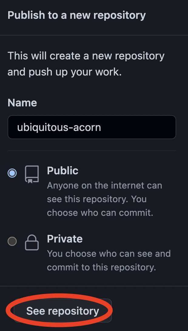 - 在这里,你可以给你的项目起一个更容易识别的名字,使项目公开,并通过 “See repository” 按钮查看你的资源库。