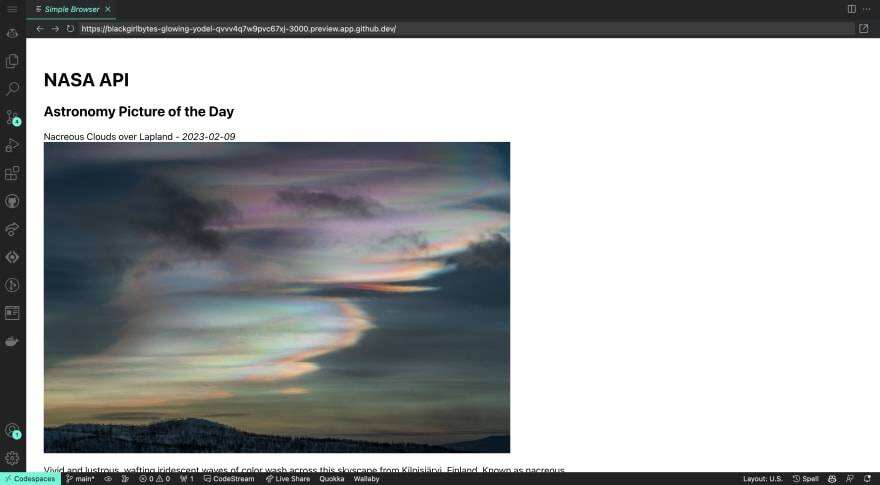Axios是我们用来调用NASA API的npm包。在你的Codespace的终端运行这个命令来安装axios: