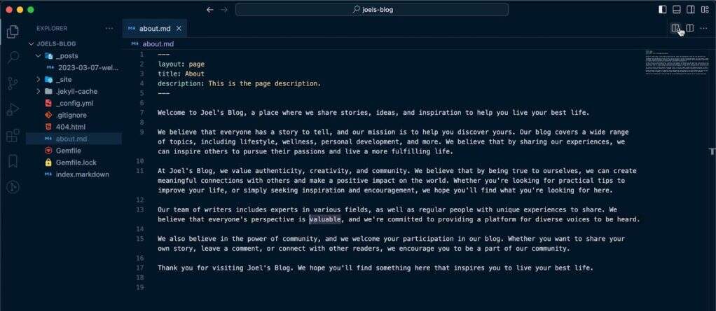 当你打开你的项目文件夹中的每个页面或博客文章时,你会注意到页面顶部的三个破折号(-)内有一个信息块。这被称为front matter。