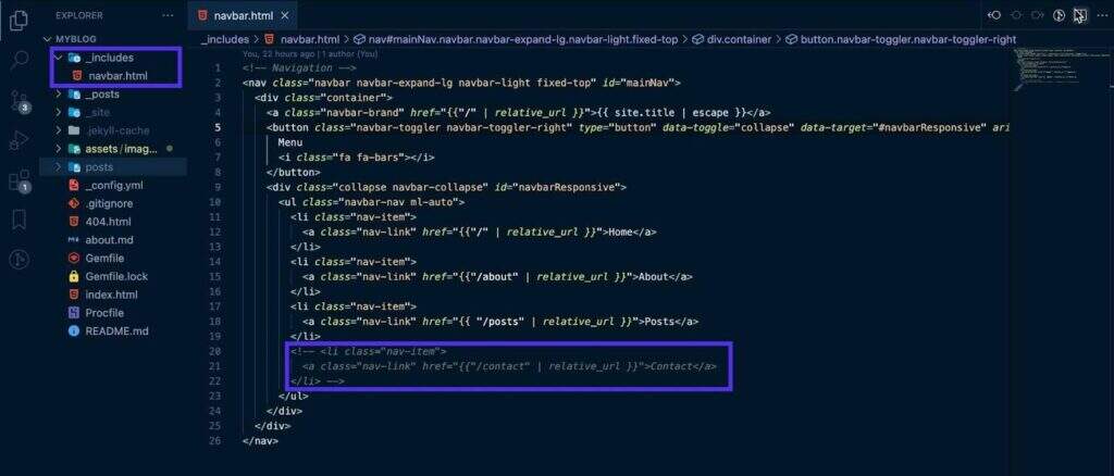 导航链接在_includes文件夹的navbar.html文件中。你可以创建这个文件,从你的源代码中粘贴代码,并删除联系选项或添加任何你想要的新选项。