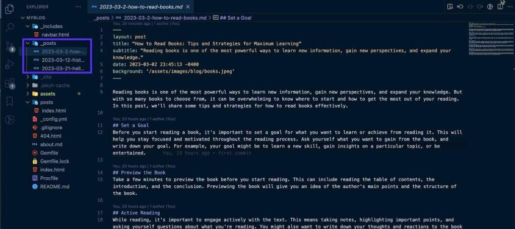 所有的内容都存储在_posts文件夹中。每个内容都存储在一个文件中,其命名规则类似于YYY-MM-DD-title.md(或HTML文件的.html)。例如,如果你想创建一个名为 “我的第一篇文章 “的文章,在_posts目录下创建一个2023-03-08-my-first-post.md。