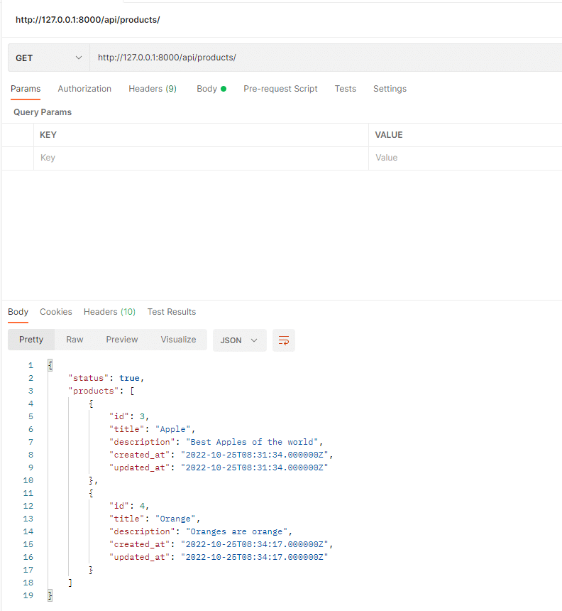 现在,您可以使用Postman创建一个新产品。首先点击此URL的 POST 请求:http://127.0.0.1:8000/api/products/.因为这是一个创建新产品的 POST 请求,所以必须传递一个带有标题和描述的JSON对象。