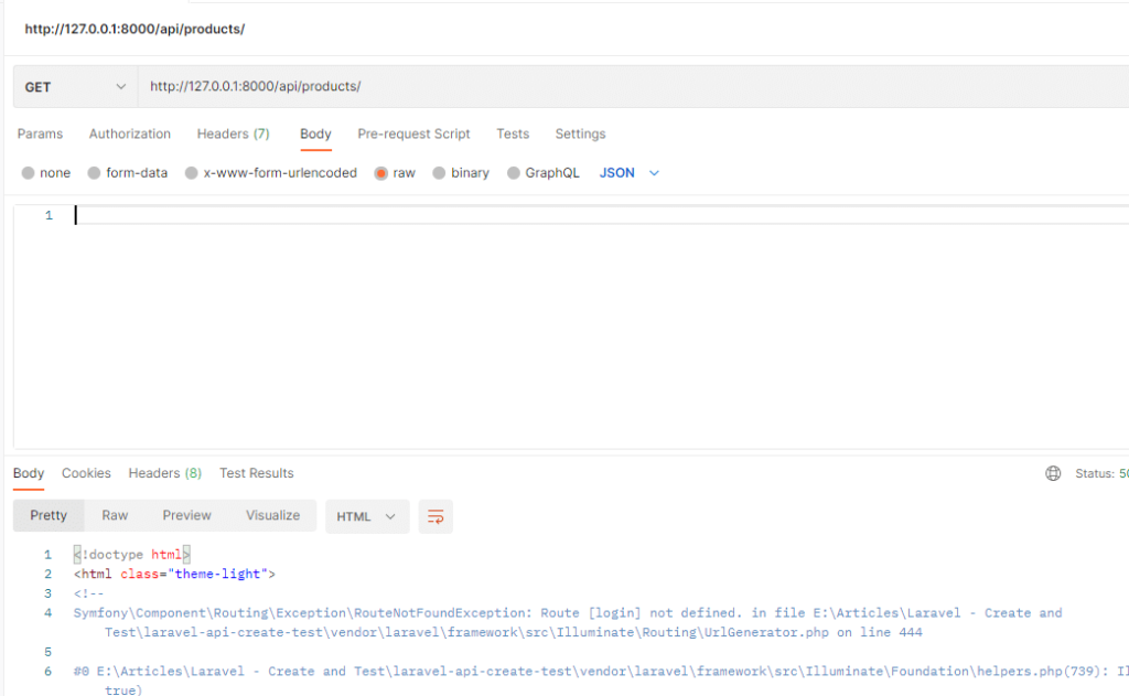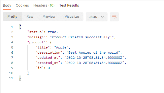 在测试API之前,请确保app/Http/Requests/StoreProductRequest.php中的authorize方法设置为返回true。
