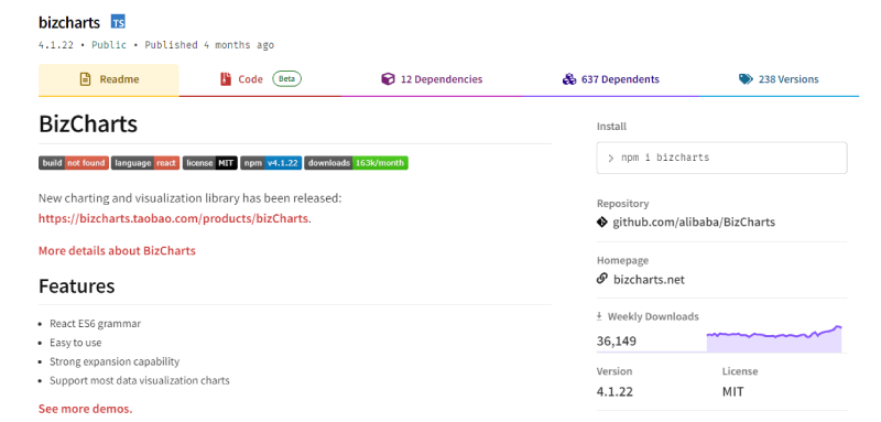 BizCharts是一个基于D3的用户友好型图表库。它最显著的优势之一是得到了阿里巴巴不断增长的社区的支持。