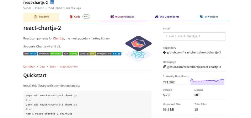 React-chartjs-2与React无缝集成。它的组件从标准的线图到散点图和气泡图。