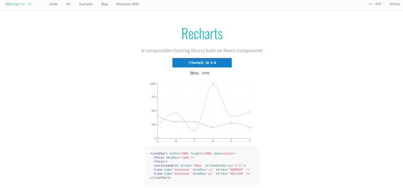 作为第一批为React创建的库之一,它为数据可视化的创建提供了一种直截了当的方法。你可以得到一些定制的可能性,但与其他工具相比,它们不太容易获得。