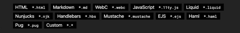 Eleventy以其简单性和灵活性著称,因为它不强迫你只使用一种模板语言或框架。它支持超过10种模板语言,甚至允许你在一个项目中使用任意多的模板语言: