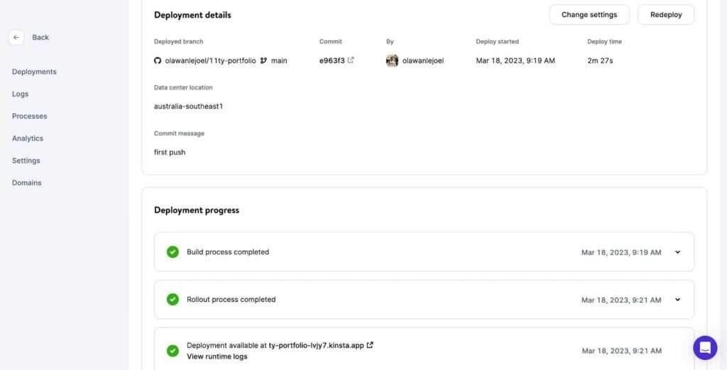 你的应用程序将开始部署。在几分钟内,将提供一个链接来访问你的网站的部署版本。在这种情况下,它是https://ty-portfolio-lvjy7.kinsta.app/