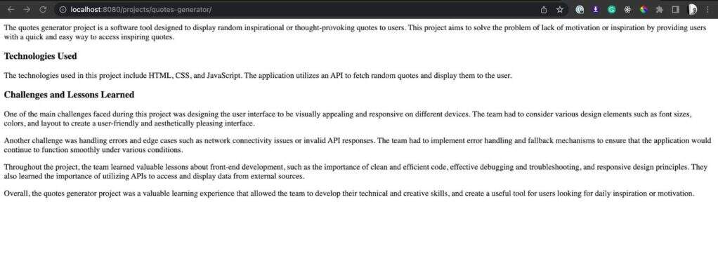 --- title: Quotes Generator description: "Helps you generates quotes from about 1600 quotes written by different authors . Quotes are automatically copied to your clipboards." gitHubURL: "https://github.com/olawanlejoel/random-quote-generator" image: "/assets/quotes-banner.jpeg" --- The quotes generator project is a software tool designed to display random inspirational or thought-provoking quotes to users. This project aims to solve the problem of lack of motivation or inspiration by providing users with a quick and easy way to access inspiring quotes. ### Technologies Used The technologies used in this project include HTML, CSS, and JavaScript. The application utilizes an API to fetch random quotes and display them to the user. ### Challenges and Lessons Learned One of the main challenges faced during this project was designing the user interface to be visually appealing and responsive on different devices. The team had to consider various design elements such as font sizes, colors, and layout to create a user-friendly and aesthetically pleasing interface. Another challenge was handling errors and edge cases such as network connectivity issues or invalid API responses. The team had to implement error handling and fallback mechanisms to ensure that the application would continue to function smoothly under various conditions. Throughout the project, the team learned valuable lessons about front-end development, such as the importance of clean and efficient code, effective debugging and troubleshooting, and responsive design principles. They also learned the importance of utilizing APIs to access and display data from external sources. Overall, the quotes generator project was a valuable learning experience that allowed the team to develop their technical and creative skills, and create a useful tool for users looking for daily inspiration or motivation.