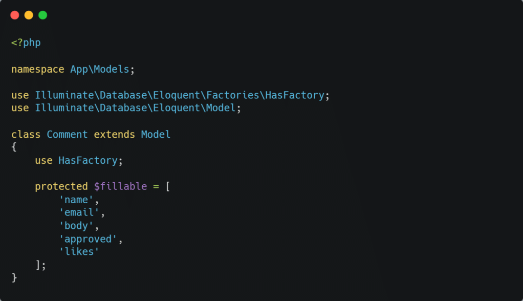 这段代码列出了你想允许大量分配的字段, 因为Laravel默认会保护你的数据库不被大量分配。Comment模型文件现在看起来应该是这样的: