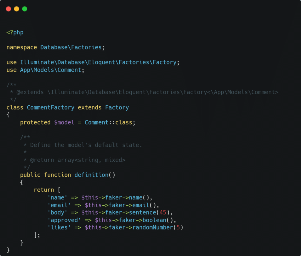 CommentFactory里面的函数定义了Faker如何生成假数据。把它编辑成这个样子: