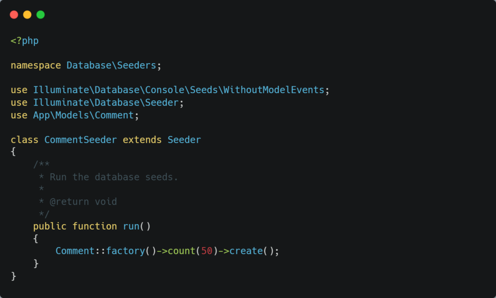 将Comment模型连接到CommentSeeder上。在运行函数中添加以下代码: