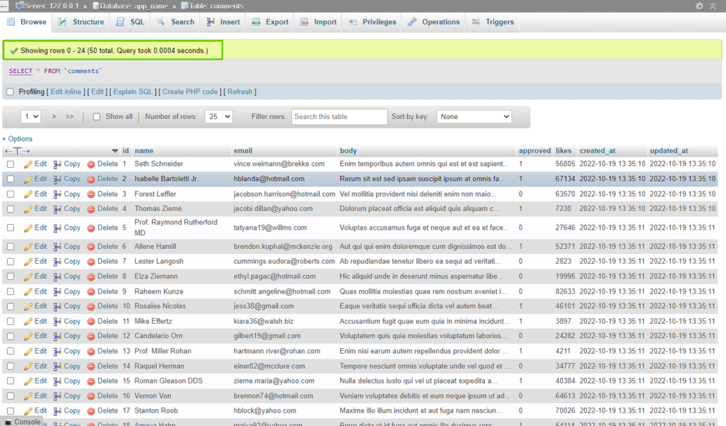 现在数据库应该有50行假数据,你可以用它来测试你的应用程序的功能:
