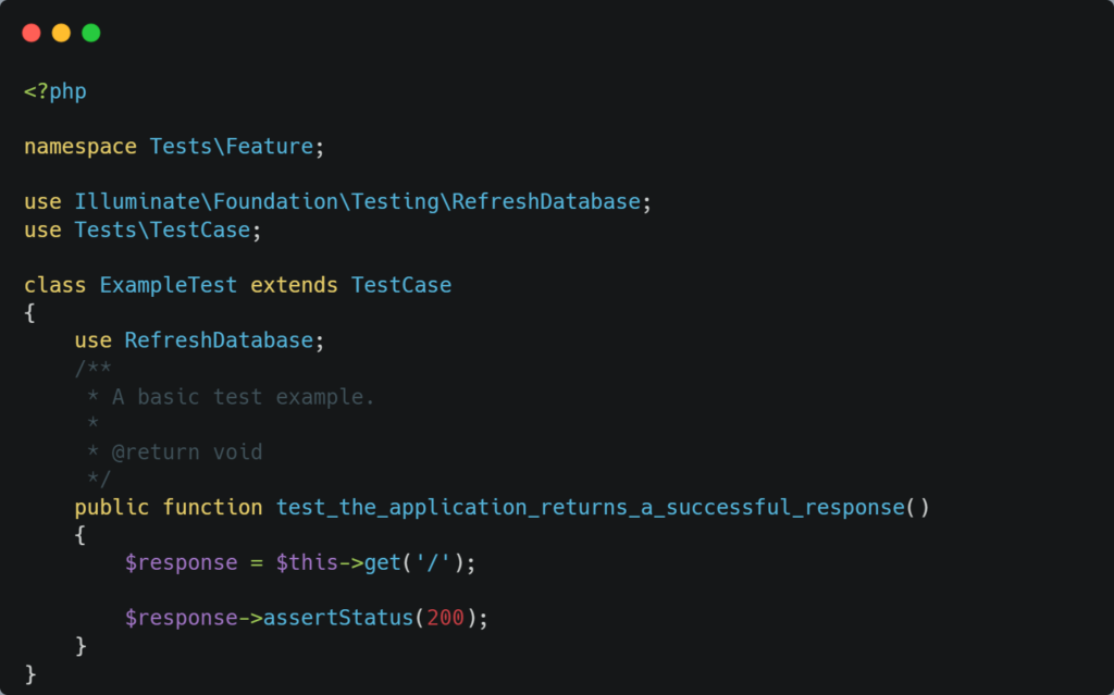 导航到Test/Feature文件夹内的ExampleTest.php,在评论的 use Illuminate\Foundation\Testing\RefreshDatabase; 并在 test_the_application_returns_a_successful_response 函数上方添加以下一行代码: