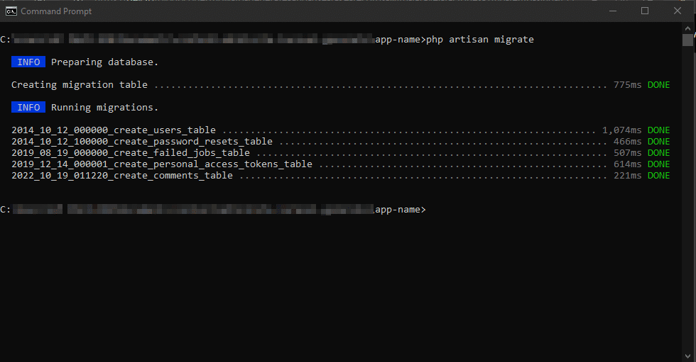 这个命令在database/migrations中运行所有的迁移,因为这是自创建应用程序以来的第一次迁移: