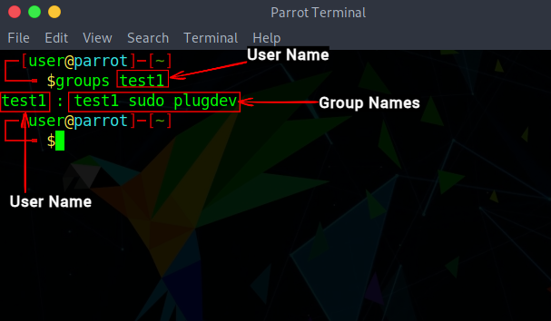 要查看与一个用户相关的所有群组,你可以使用 group 命令或 id 命令。检查你的语法,如下所示: