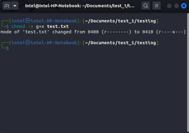 现在让我们看看一些例子,看看我们如何在Linux中使用符号模式设置权限。假设你想为组设置执行权限,那么使用这个命令: