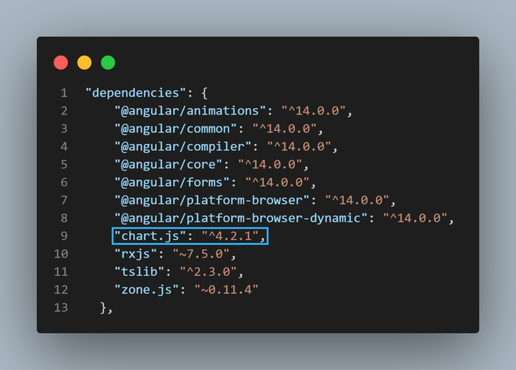 为了确认chart.js已经被安装,你可以检查你的项目中的 package.json 文件。你应该在 dependencies 对象中看到chart.js的版本,如下图所示: