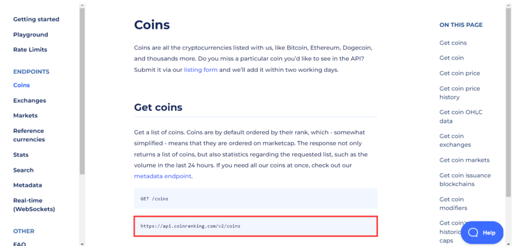 要整合REST API,请使用此链接前往Coinranking网站。你应该看到一个类似这样的页面: