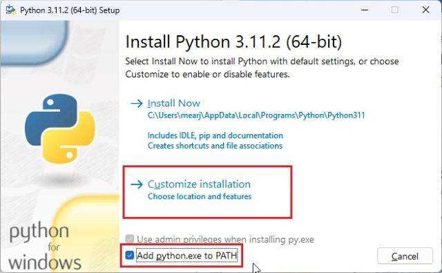 2. 之后,点击 “Customize installation“,确保 “pip” 与其他选项一起被启用。点击 “Next”,然后点击 “Install”。