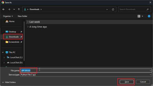 2. 现在,将其保存为 “Downloads” 文件夹中的 “get-pip.py” 文件。
