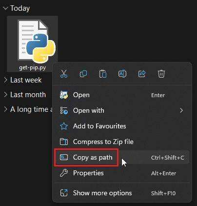 4. 最后,打开终端,按以下方式执行。输入 python,加一个空格,然后粘贴路径。之后,点击回车,Pip将被安装在你的Windows 11/10电脑上。