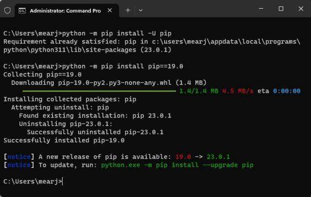 2. 如果你想把Pip降级到一个特定的版本,请运行以下命令: