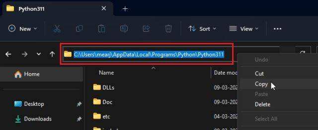 2. 之后,打开另一个 “Python3XX” 文件夹。现在,从地址栏中复制整个路径。这就是你需要添加为环境变量的Python的路径。
