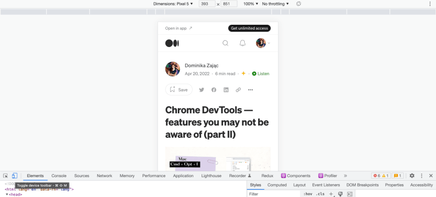 现代网页开发并不容易–我们必须确保我们的网页不仅在笔记本电脑上看起来不错,而且在手机、平板电脑、大屏幕等设备上也是如此。而Chrome DevTools在检查我们的网页的响应性时也可能是有用的。只要点击靠近选择器图标的移动预览按钮(顶部菜单中从左边开始的第二个图标),然后在页面预览上方的菜单中选择设备、宽度、高度和设备方向。玩不同的尺寸–由于这一点,你可以注意到你的网页在不同设备上的行为的一些问题!Pixel 5手机上的网页预览。注意启用响应模式的图标–它以蓝色标记,下面有一个工具提示。