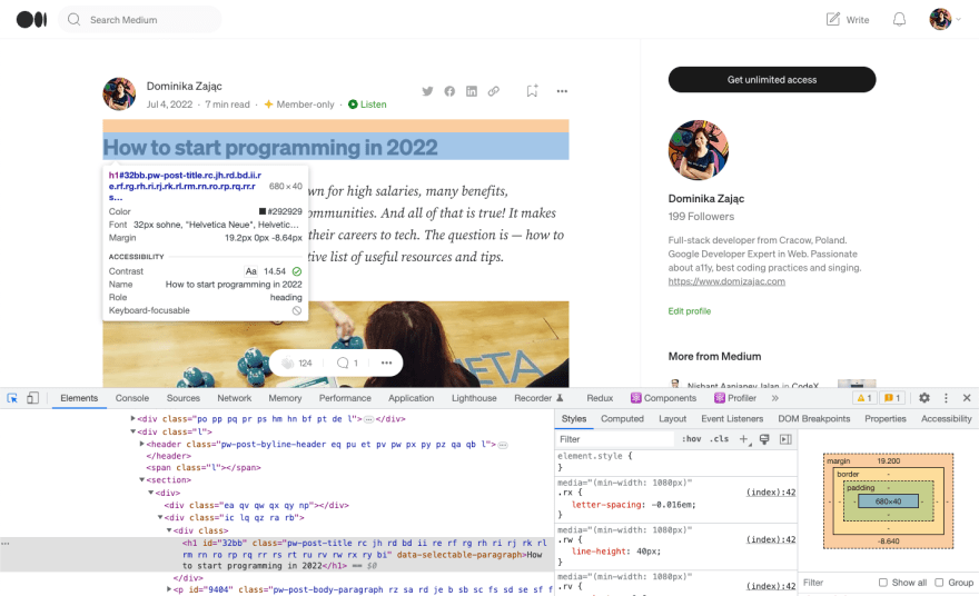 我们在这里可以看到什么?”How to start programming in 2022″ 是一个标有id=”32bb” 的h1标签的标题元素,并应用了许多样式类(不要担心它们的命名–这是Javascript丑化和减化对页面的影响,使源代码更小,加载更快,更难被其他开发者窃取:) ). 这个弹出窗口向我们展示了造型的摘要–颜色、字体、边距和元素的对比。橙色区域显示了应用于该元素的上边距(注意,在DevTools中,右侧有一个彩色的盒子,从这里我们可以读出上边距为19.2px)。还有一个部分是关于应用于这个元素的所有样式的信息。我将在下面的章节中多写一点关于样式的内容,但不要害怕玩一下所有这些选项。你不会破坏任何东西–我保证(你的所有改动在重新加载页面后会被删除)。