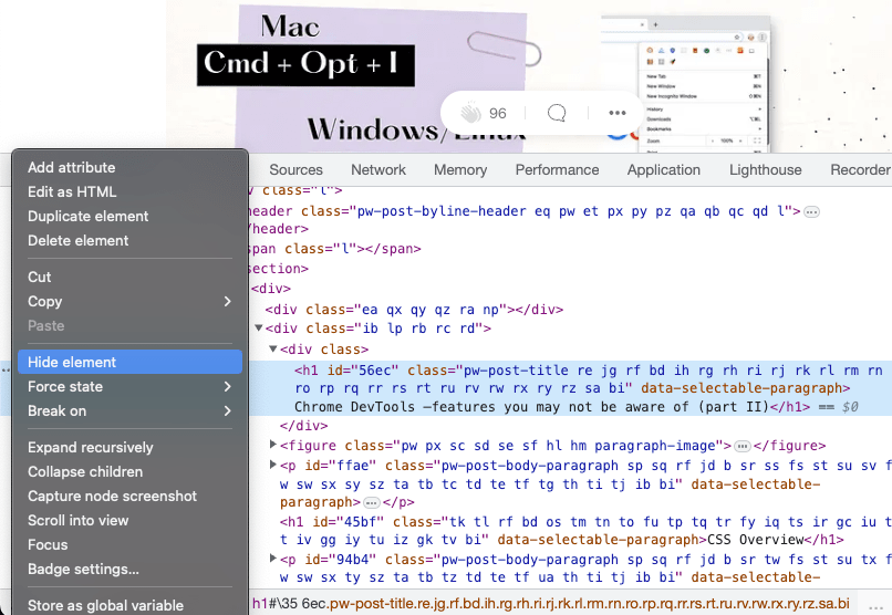 当你在网页上看到一些问题时,你可能想把注意力集中在某个特定的区域/节点上,而不是看整个页面。有几种方法可以做到这一点:你可以直接右键点击页面上的元素,然后从菜单中选择检查选项(即使页面上没有打开Chrome DevTools,它也能发挥作用),你可以在元素预览中通过扩展部分找到该元素,或者你可以点击Chrome DevTools中的选择器图标(在面板的左上方)并选择页面上的节点。
