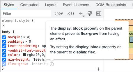 在最近的一个版本中,Chrome还增加了一些信息,即当某些规则不能应用于某个特定元素时。你可以通过灰色的字母和靠近数值的’i’图标来识别它。当你将鼠标悬停在 “i” 图标上时,你会看到一个弹出窗口,解释为什么不能应用某个特定的规则。