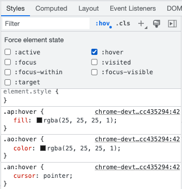 有时,页面上的元素因其状态不同而显得不同–例如,已访问的链接与未访问的链接看起来不同,按钮在鼠标悬停时可能有不同的背景色,等等。幸运的是,你也可以轻松地玩弄不同元素状态的造型。只要选择给定的节点,在 “样式 “选项卡中找到:hov按钮,然后拨动你想强制执行的状态上的复选框。这样,即使你停止在元素上悬停,你仍然可以预览和编辑应用于这个状态的样式。