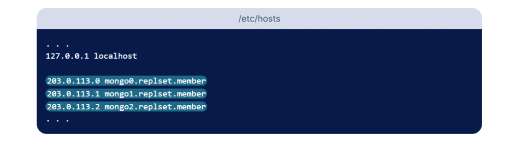 我们可以通过为每个副本成员配置子域来做到这一点。虽然这可能是生产环境的理想选择,但本节将概述如何通过编辑每个服务器各自的hosts文件来配置DNS解析。这个文件允许我们将可读的主机名分配给数字IP地址。因此,如果在任何情况下,你的IP地址发生了变化,你所要做的就是更新三个服务器上的hosts’文件,而不是从头开始重新配置副本集!