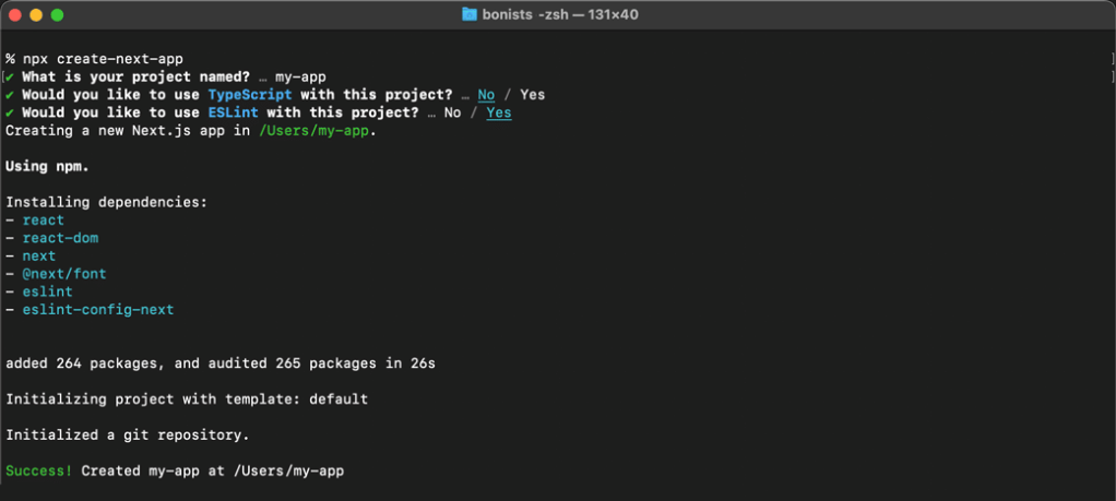 在没有额外参数的情况下,create-next-app 的安装将以交互模式进行。你将被要求提供一个项目名称(将用于项目目录),以及你是否要包括对TypeScript和代码linter ESLint的支持。